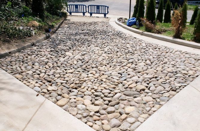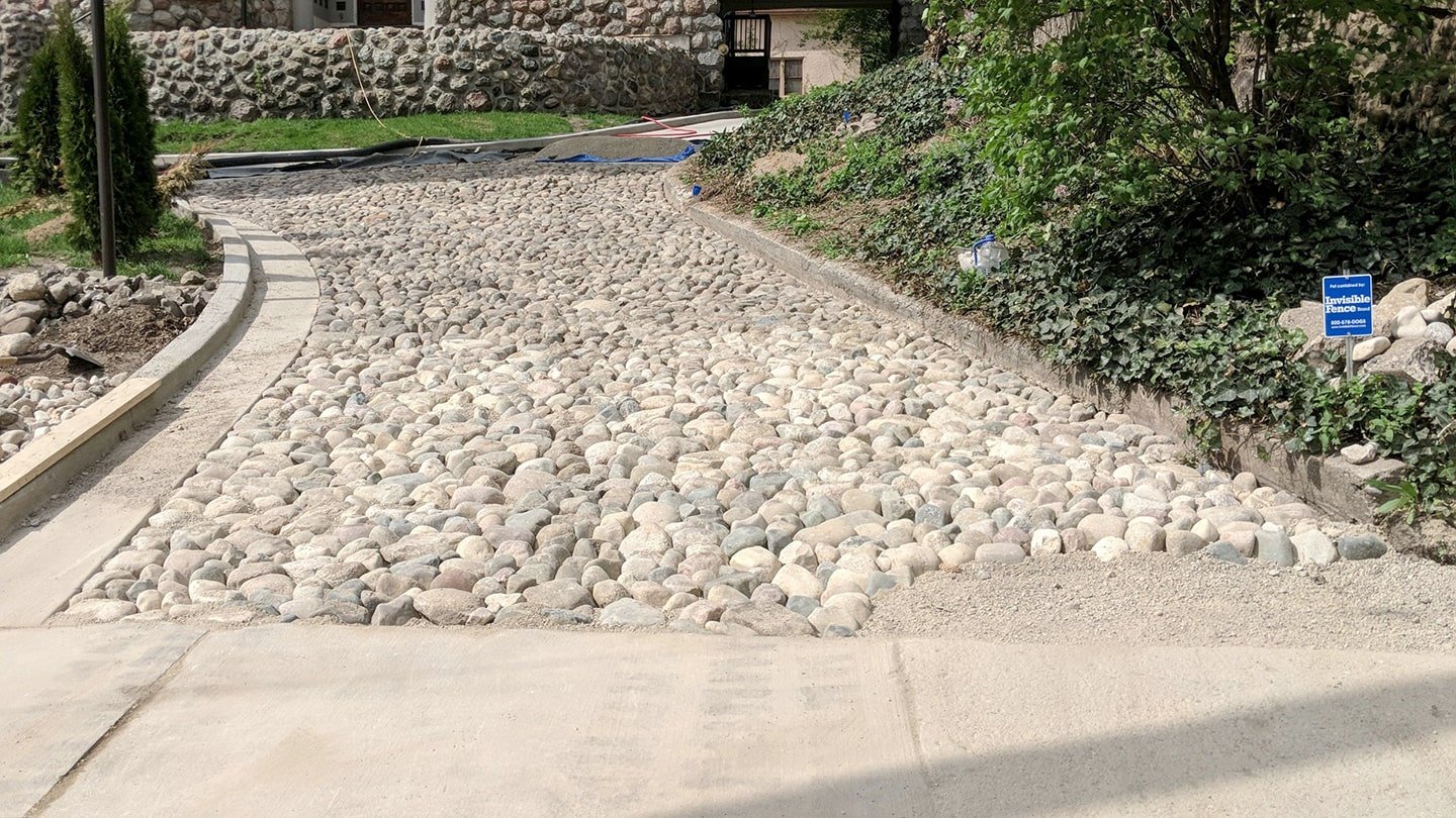 The scope of this project was to remove the affected infill soil in the drive where the previous cobblestone sections had been removed and replace it with a new cobblestone driveway. We removed the infill soil down to an adequate depth to prepare the driveway for the cobblestone installation. The original cobblestones were utilized and installed in the same manner as the original driveway. The cobblestones were tamped and leveled into a gravel base with limestone chips interspersed between stones. Upon completion, we used a consolidate to help reduce and prevent future washout.