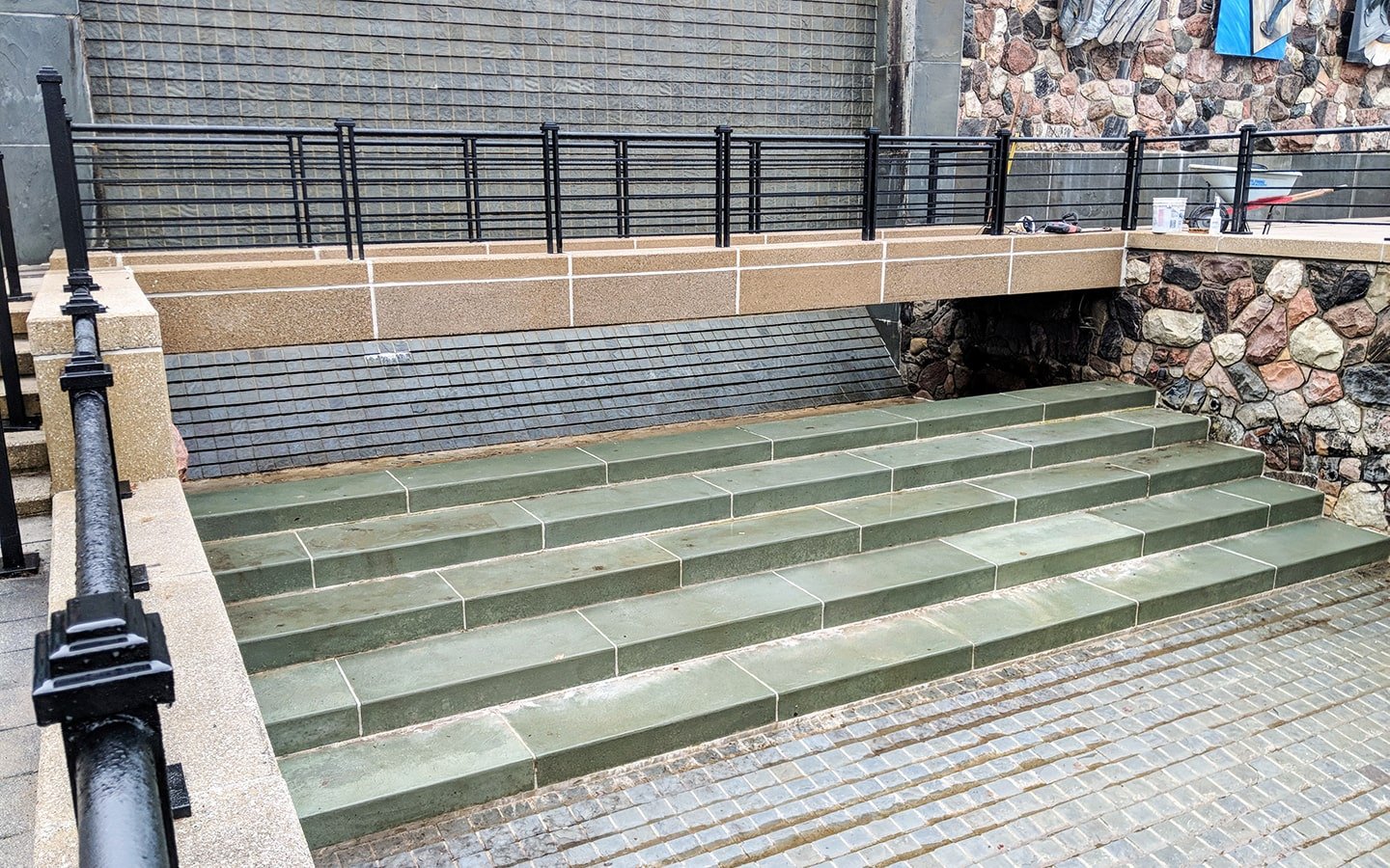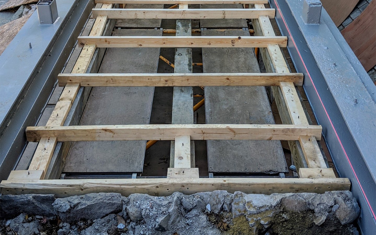 - The existing galvanized beams were completely cleaned and cold galvanized followed by an epoxy topcoat system. New reinforced concrete with epoxy coating was installed as well as a series of five surface drains to allow for drainage down onto the runnel. Once the concrete slab cured a waterproofing membrane was applied as well as a drainage layer. The pavers were then reinstalled. All cast stone was replaced to match existing cast stone. The deck below the bridge was re-waterproofed upon completion of the upper deck work.