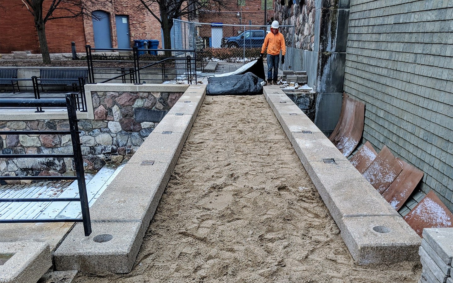 - The bridge handrails were removed to be sandblasted clean, primed and painted offsite until completion. All precast side and top panels at the railing sections along with the structural slab and pan system were demolished. Pavers were removed and stored until completion.