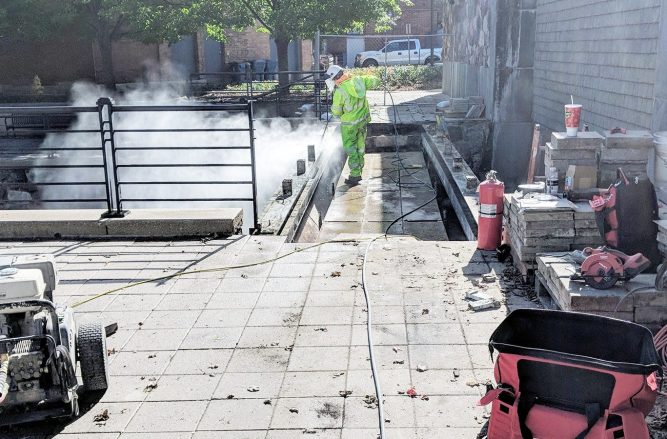 The scope of this project was to remove and replace the decking, railing and paving system on the bridge over the fountain while leaving the beams themselves intact. To complete this work we performed the following: